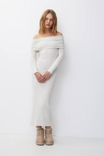 Long Knit Dress With Bardot Neckline Grey Marl | Women Long