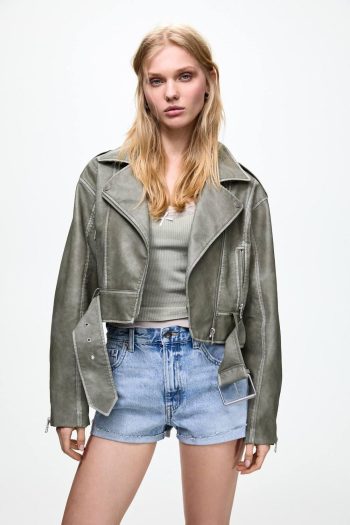 Oversize Faux Leather Biker Jacket Pale Khaki | Women Biker Jackets