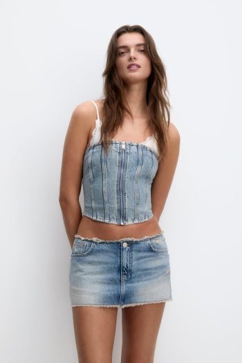 Denim Mini Skirt With Frayed Trims Medium Blue | Women Mini