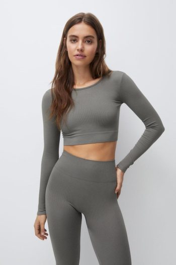 Seamless Cropped Long Sleeve T-Shirt Medium Khaki | Women Long Sleeve