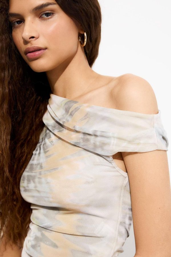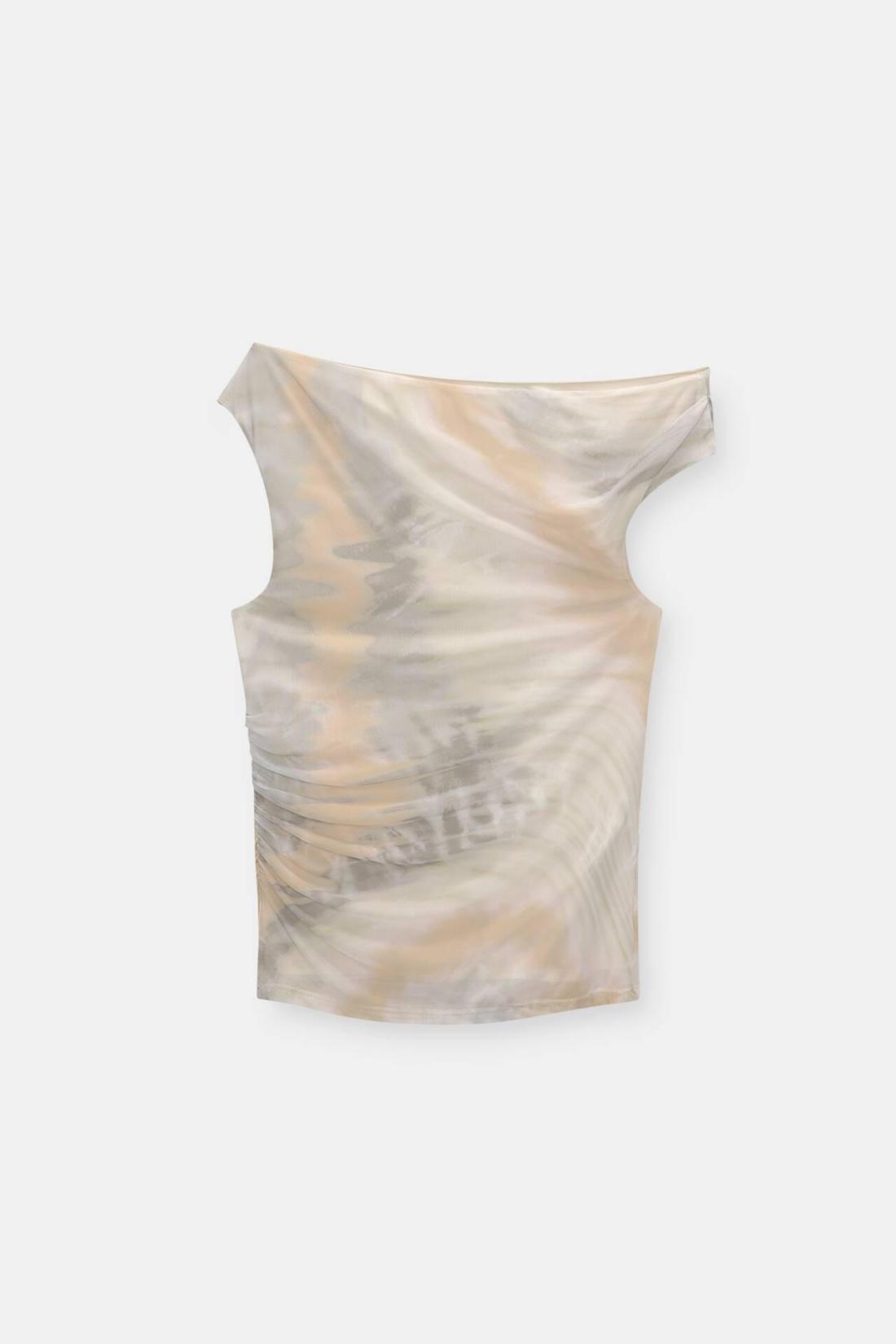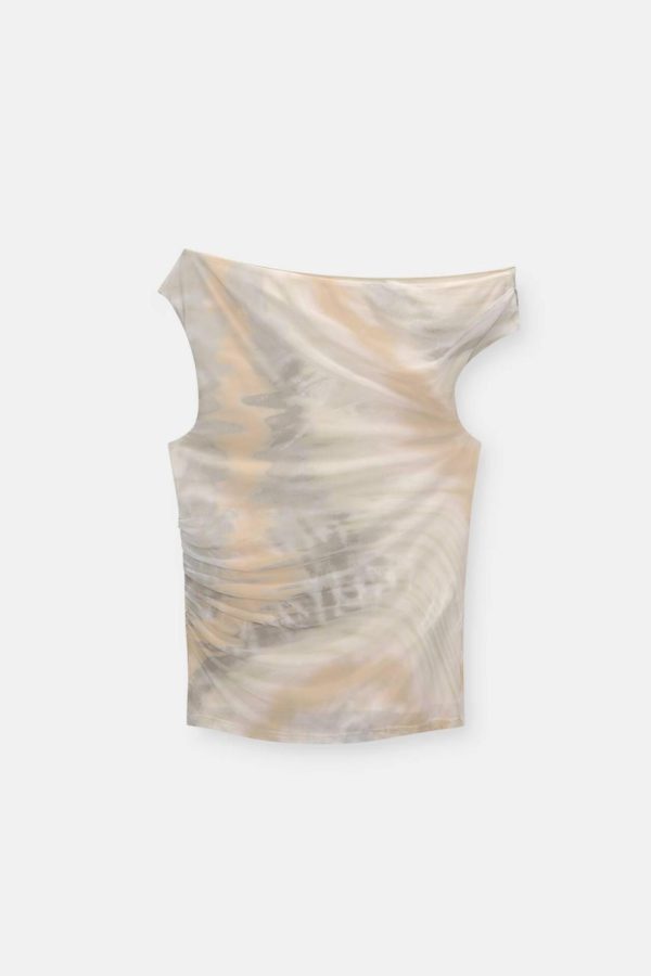 Tie-Dye Print Tulle Top With Asymmetric Neckline And Gathered Detail. Made Of Very Stretchy Fabric. Composición