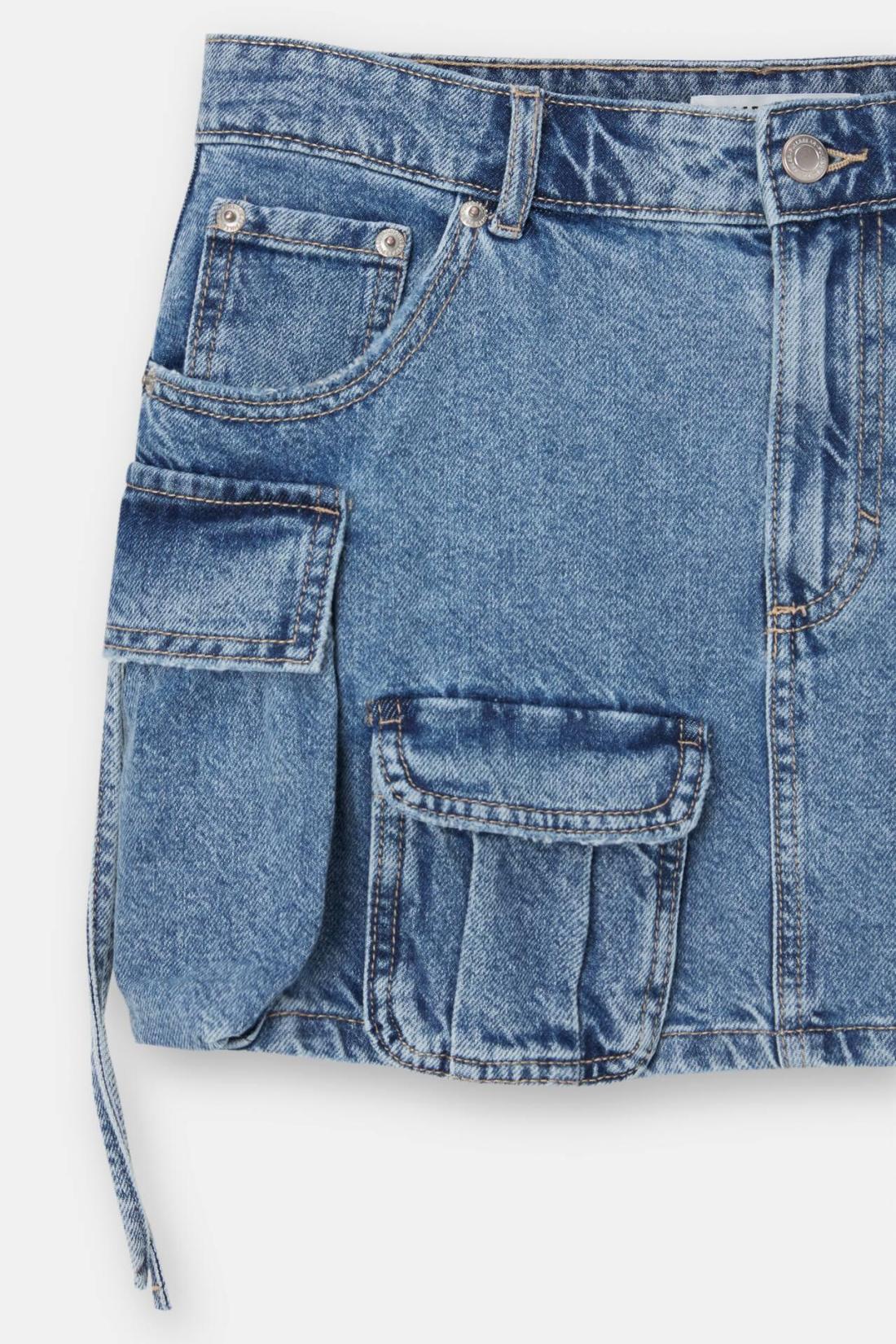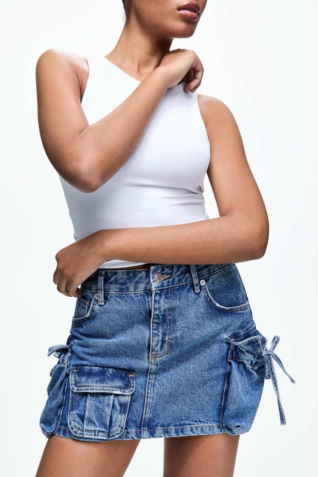 Denim Cargo Mini Skirt With Multiple Pockets, Belt Loops And Strap Details. Composición