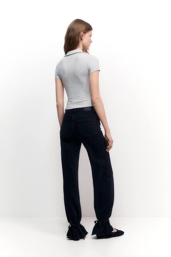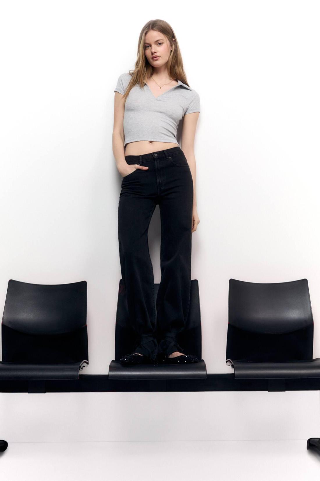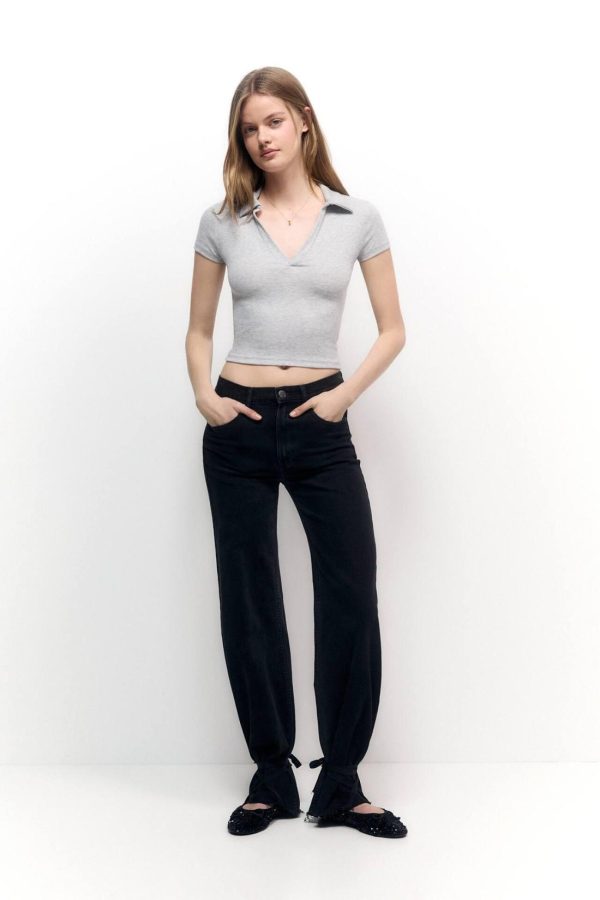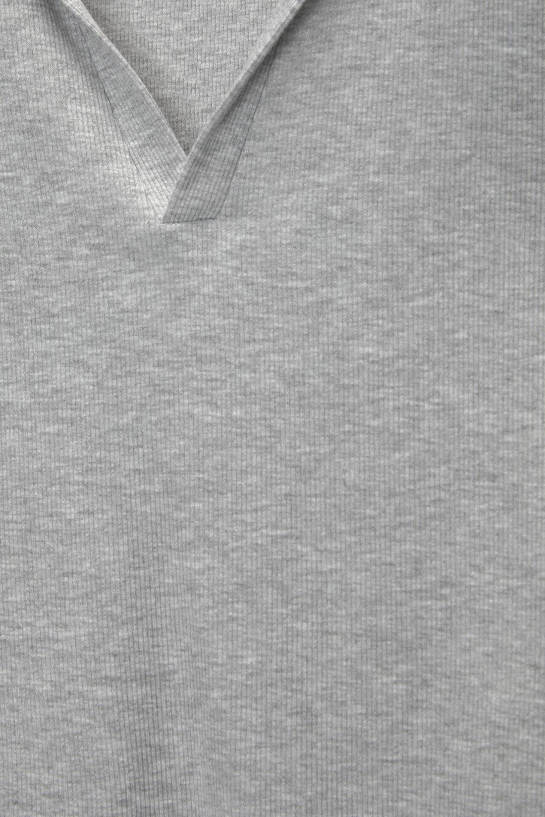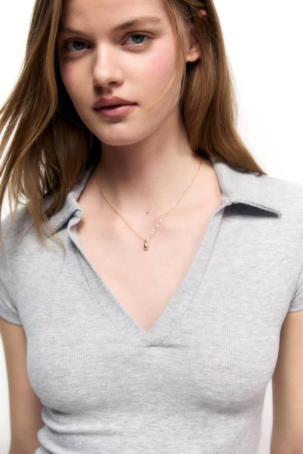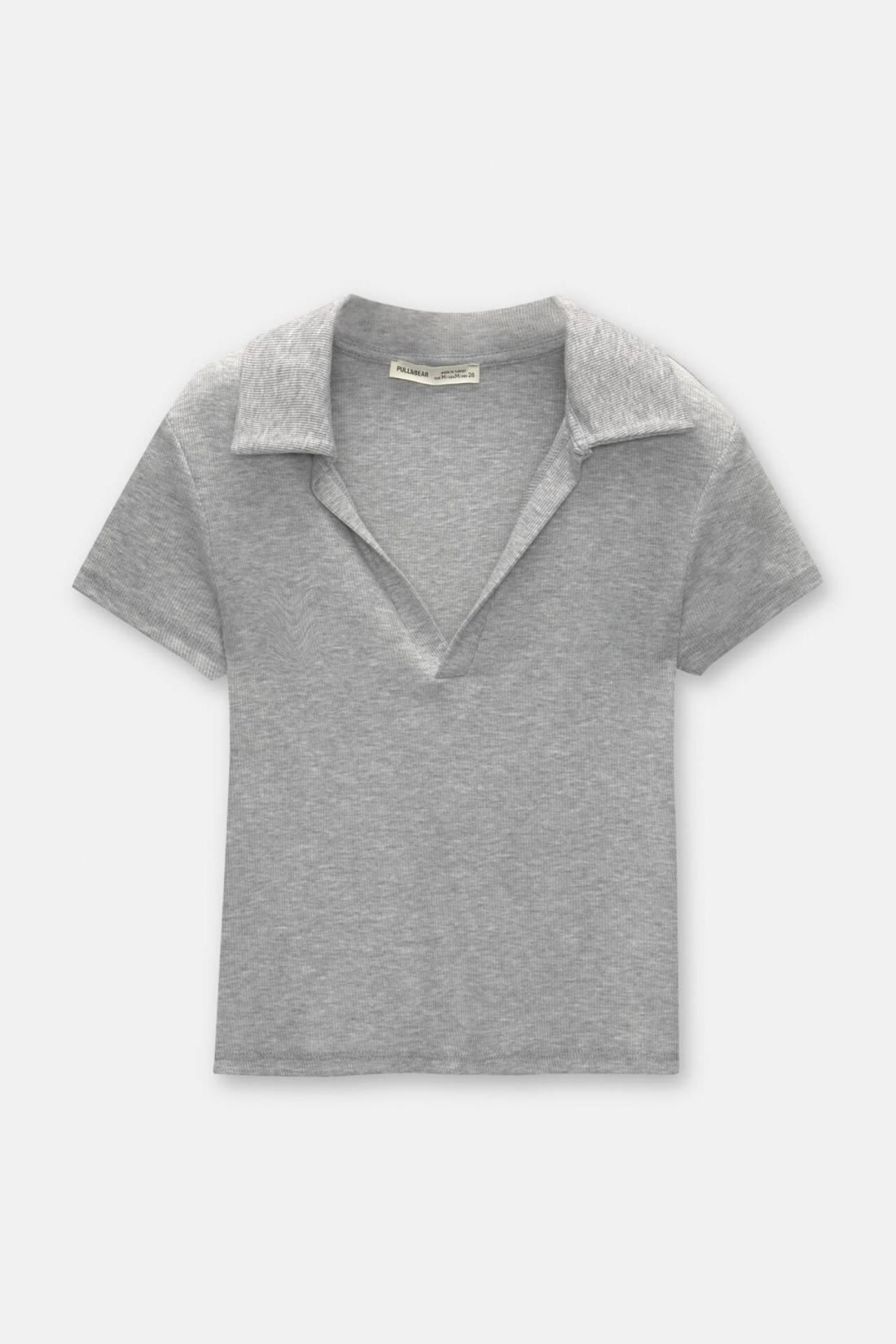 Fitted Ribbed Polo Shirt With Short Sleeves And A V-Neck. Made Of Slightly Stretchy Fabric.