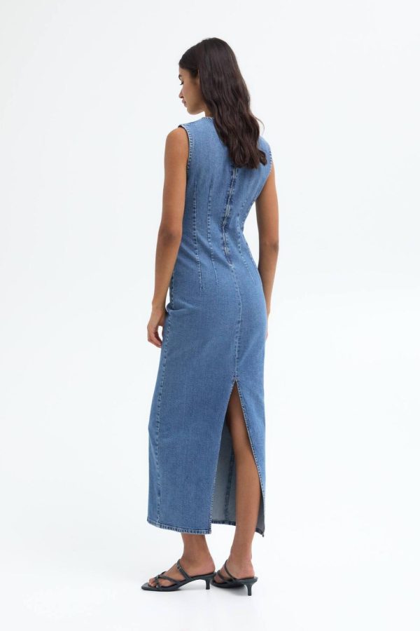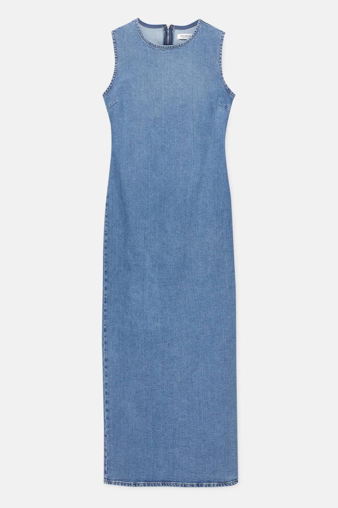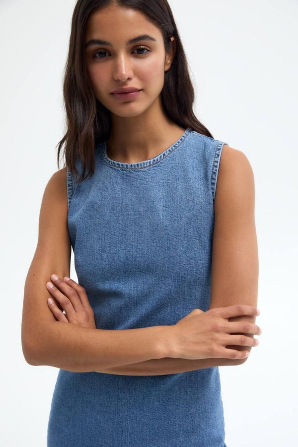 Long Sleeveless Denim Dress With A Crew Neck. Made Of Slightly Stretchy Fabric.