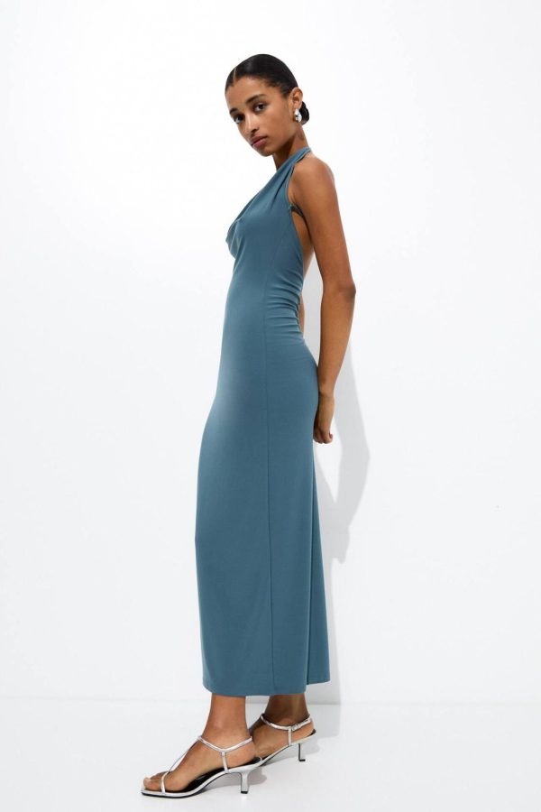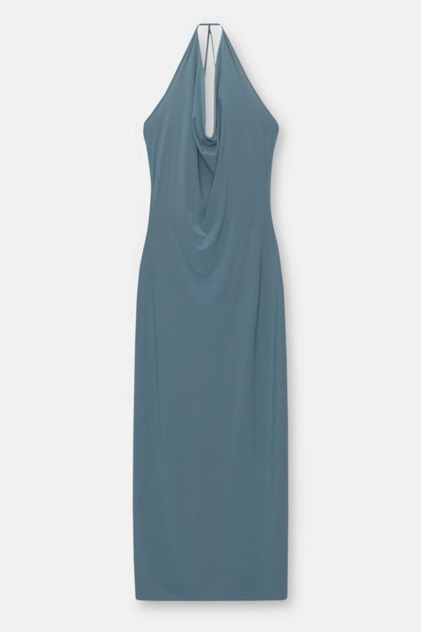 Long Fitted Halter Dress With Draped Detail And An Open Back. Made Of Stretch Fabric.