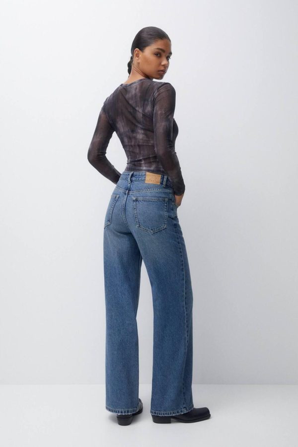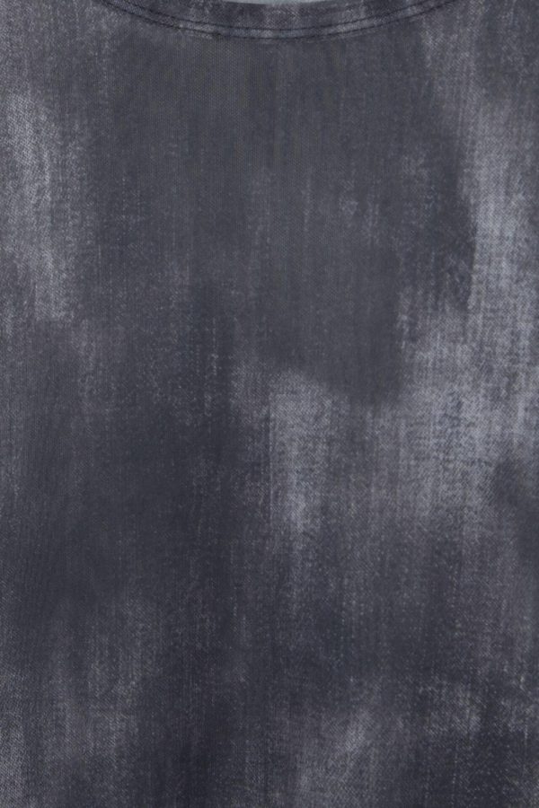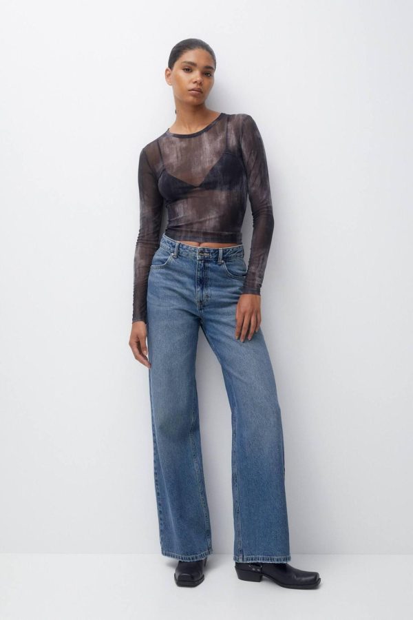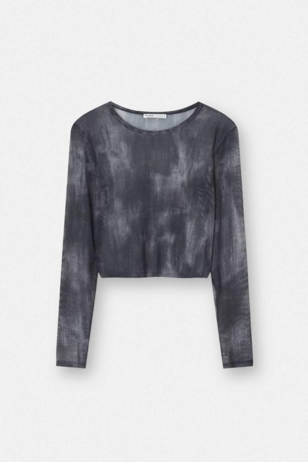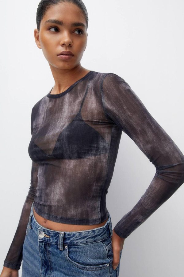 Long Sleeve Tulle Top With A Round Collar, Print And Sheer Details.