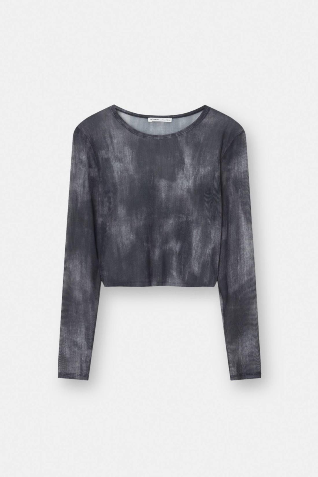 Long Sleeve Tulle Top With A Round Collar, Print And Sheer Details. Composición