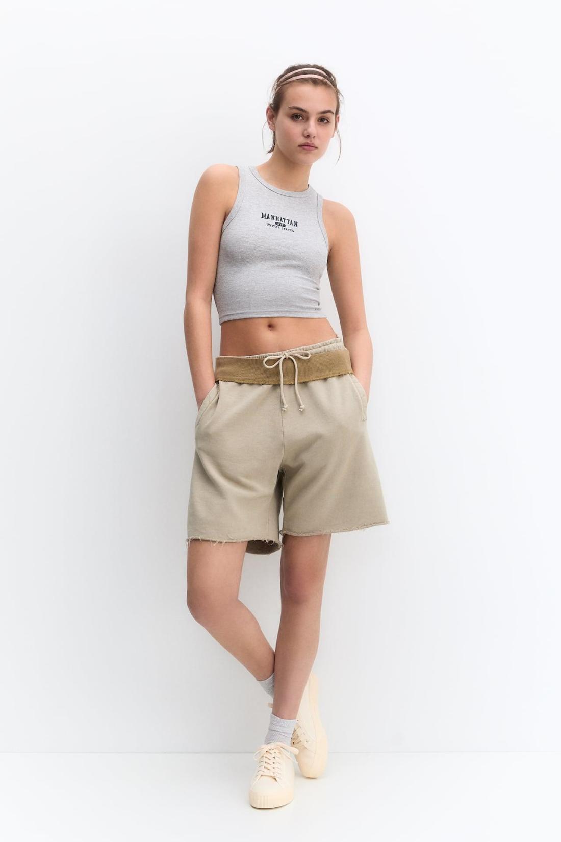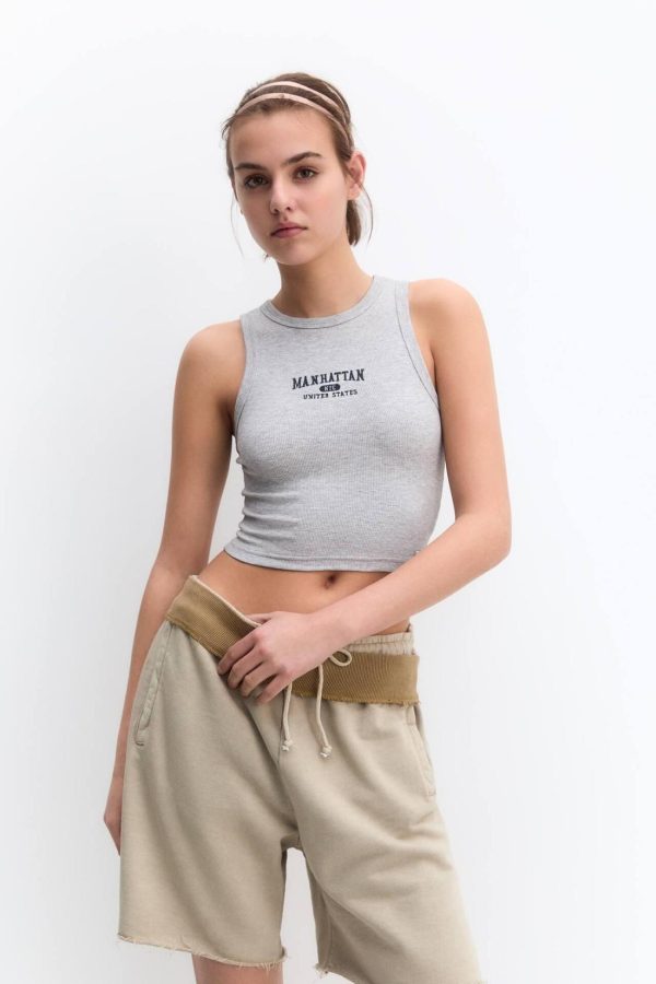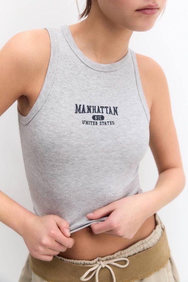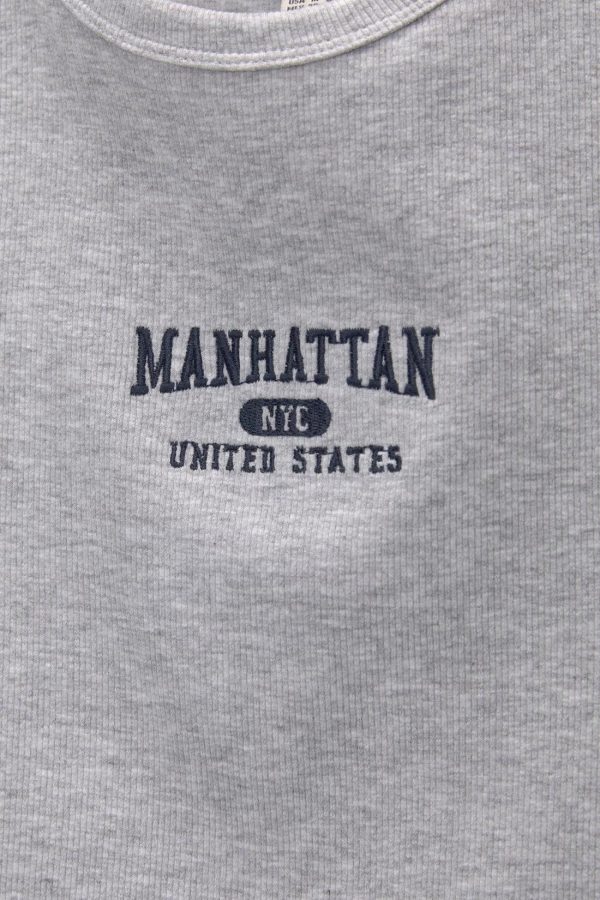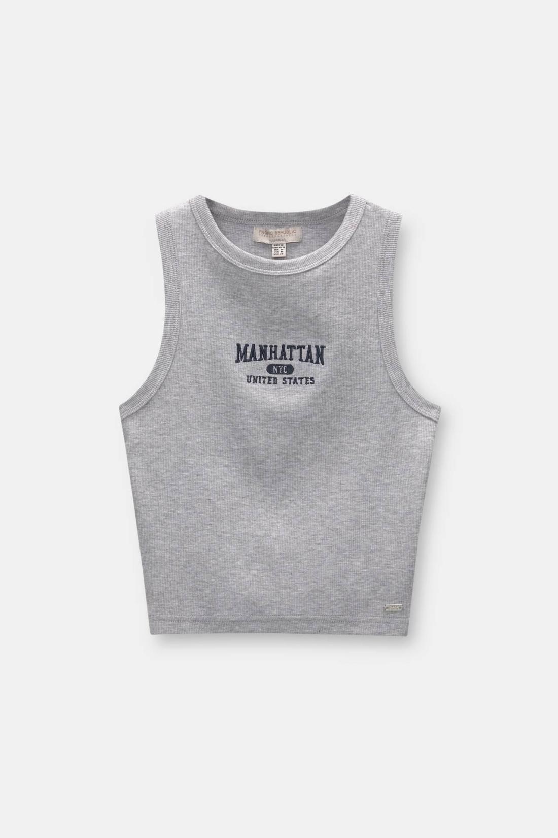 Gray Round Collar Tank Top Featuring An Embroidered Manhattan Slogan On The Front And A Round Collar. Made Of Cotton.