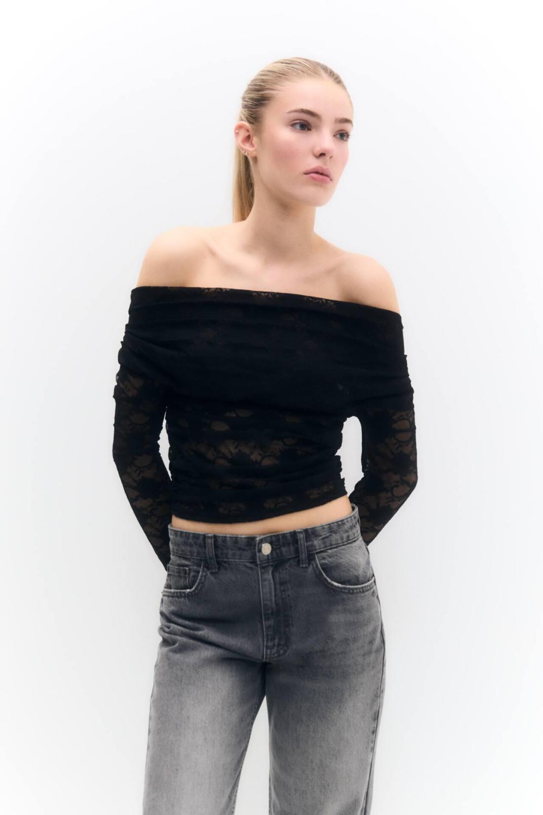 Off-The-Shoulder T-Shirt With Long Sleeves And Lace Detail. Composición