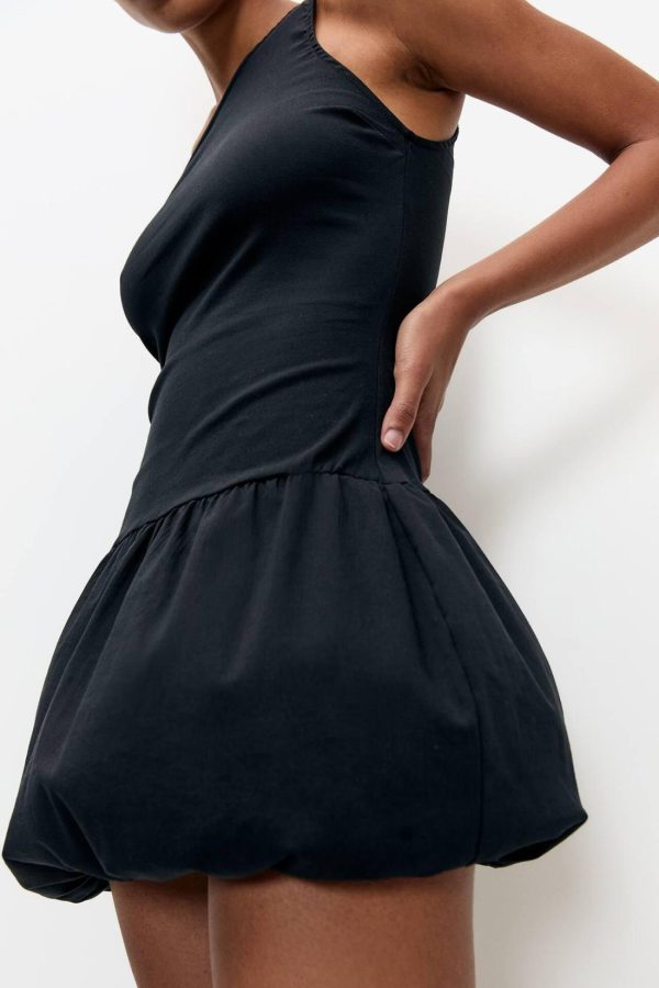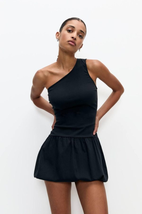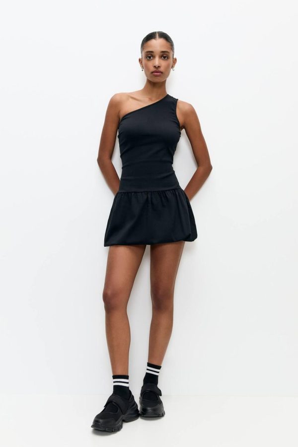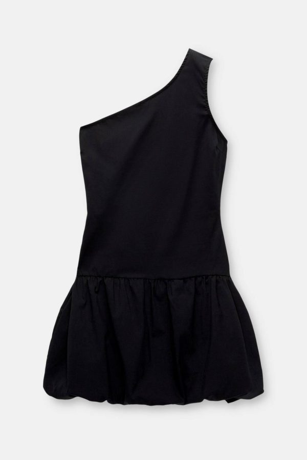 Short Dress With A Balloon Skirt And An Asymmetric Neckline. Made Of Stretch Fabric.