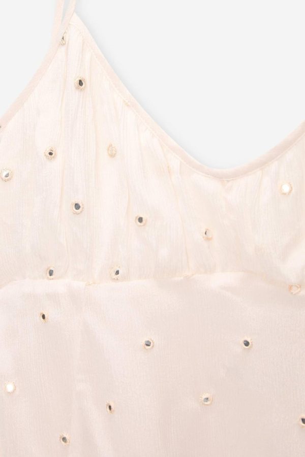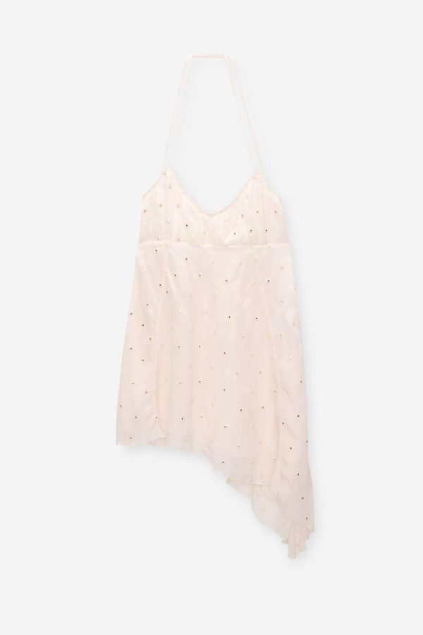 Short Flowing Dress With An Asymmetric Hem, Mirror Details, An Open Back And Thin Straps.